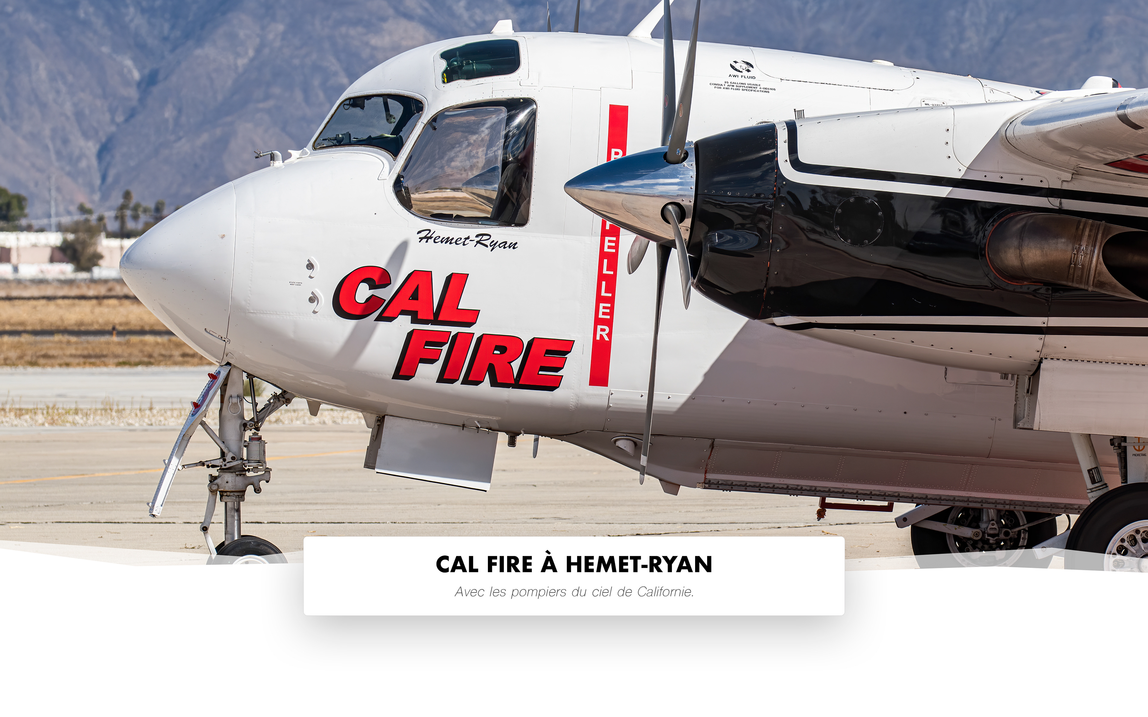 Confrontée depuis plusieurs années à une sécheresse record, la Californie est de plus en plus souvent en proie à de très violents incendies, parfois incontrôlables et meurtriers. Avec le “Hillside Fire” à San Bernardino, l’“Easy Fire” à Simi Valley ou le “Kincade Fire” dans le comté de Sonoma, l’automne 2019 aura une fois de plus mis la lumière sur la situation explosive dans laquelle se trouve l’État de Californie. Pour lutter contre ces feux gigantesques et destructeurs, le California Department of Forestry and Fire Protection (le Cal Fire) s’appuie sur une cinquantaine d’aéronefs en renfort des troupes en action au sol. Ces moyens aériens sont dispatchés stratégiquement sur 23 sites à travers tout l’état. Cette répartition est conçue de manière à ce que les premiers avions puissent atteindre le lieu d’un incendie en 20 minutes maximum après que l’alerte ait été donnée. Localisée dans le comté de Riverside, à quelques encablures de la base aérienne de March ARB, l’Air Attack/Helitack Base d’Hemet-Ryan joue depuis 1959 un rôle essentiel dans la lutte anti-incendie pour tout le Sud de la Californie, des montagnes de San Bernardino à la frontière mexicaine et du Pacifique jusqu’au fleuve Colorado. Quatre appareils y sont basés en permanence, à savoir : un Bronco (callsign : Air Attack 310), deux Tracker (Tanker 72/73) et un Super Huey (Copter 301).