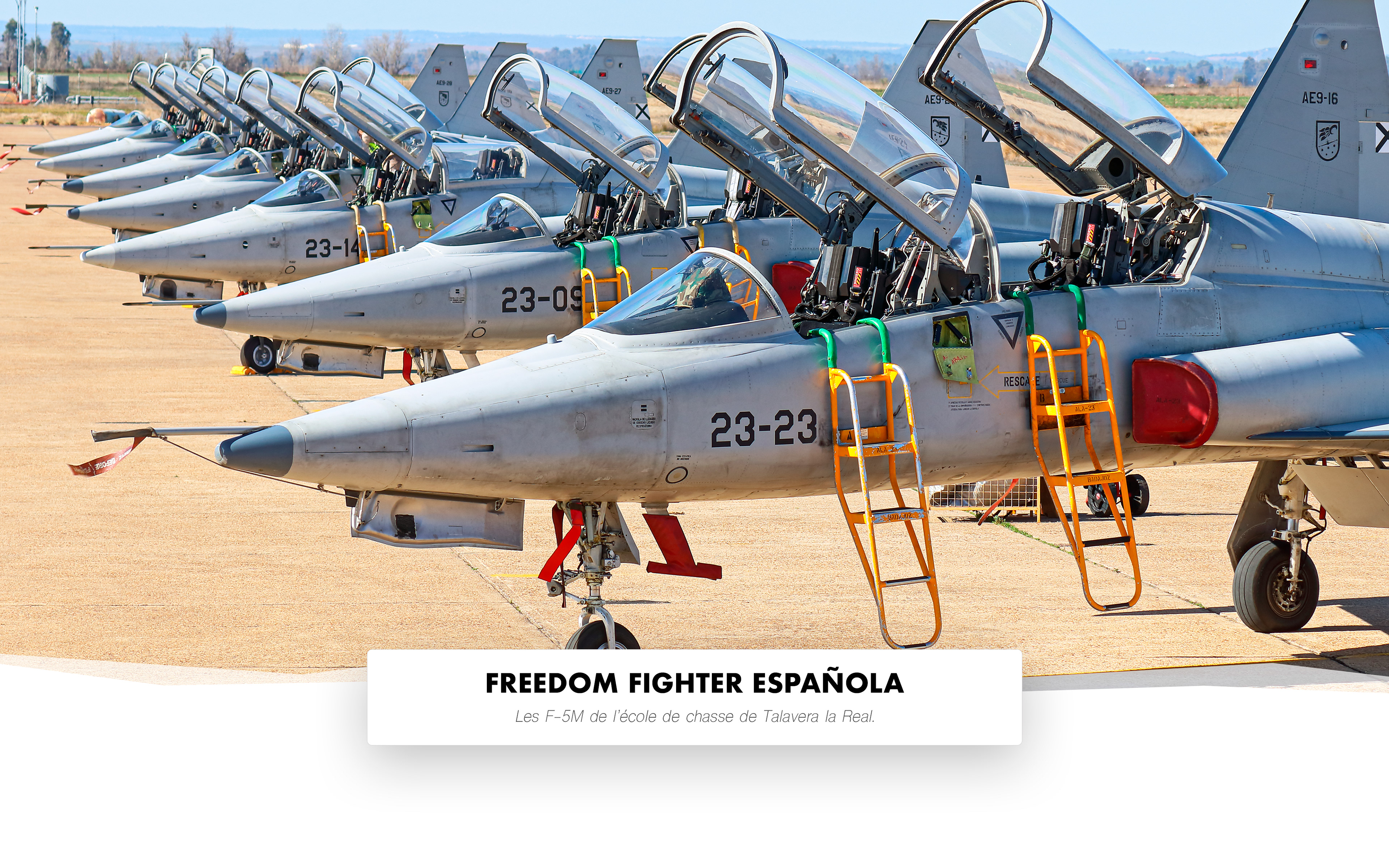 Dans la province d’Extremadura, proche de la frontière Portugaise, se trouve la base aérienne de Talavera la Real, fief des ‘Patas Negras’ de l’Ala 23. Cet escadron, responsable de la formation avancé des jeunes pilotes de chasse de l’Ejercito del Aire (Eda), est équipé, depuis 1970, de Northrop F-5M biplaces. Ces aéronefs sont les derniers représentants de la lignée des Freedom Fighter au sein de l’armée de l’air espagnole.