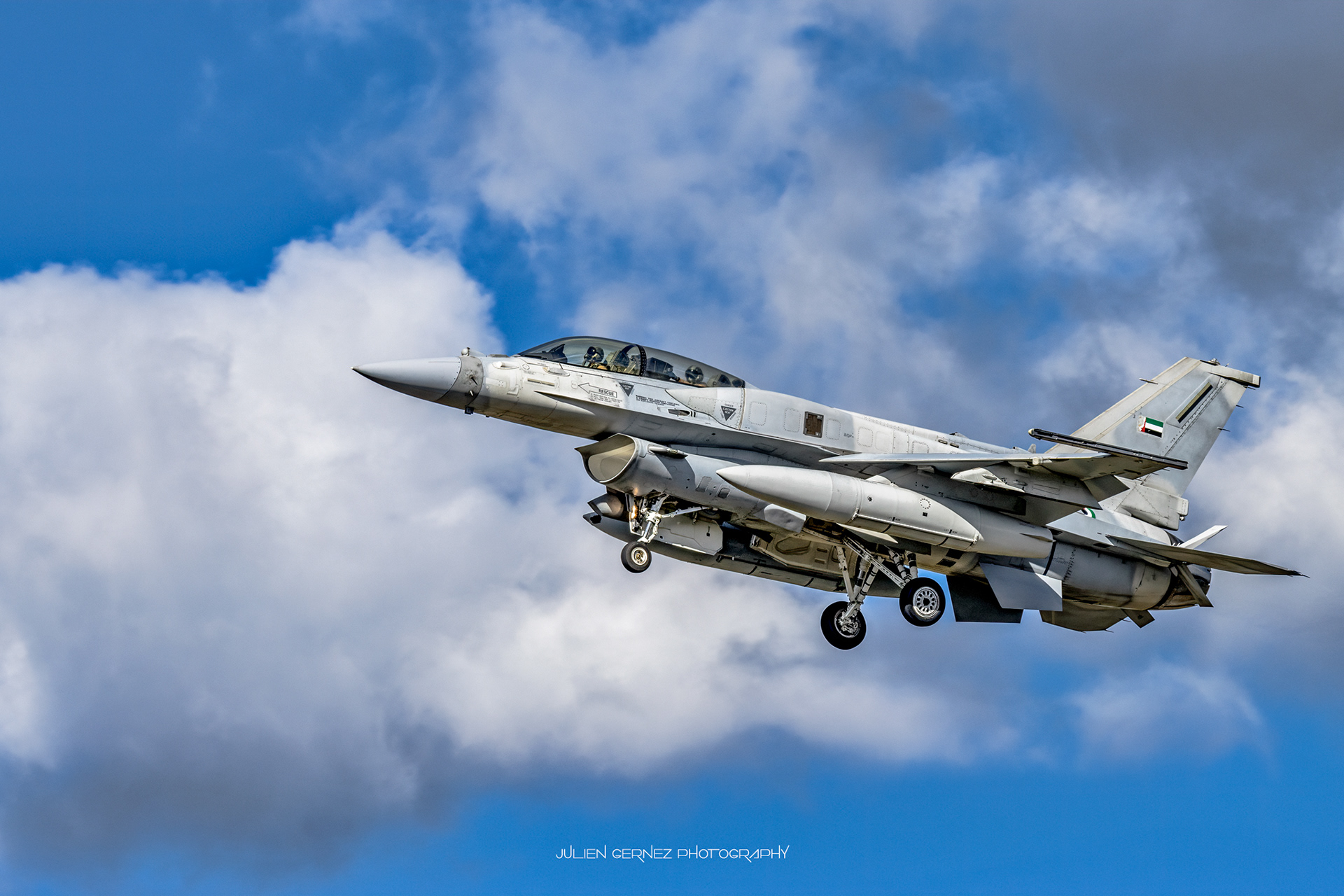 Si les pilotes de chasse émiratis ont l'occasion de s'entraîner conjointement et régulièrement avec leurs homologues de l'armée de l'air et de l'espace grâce à la présence permanente des Rafale du "Provence" sur la base d'Al Dhafra, c'était en revanche la première fois qu'un détachement des Emirats Arabes Unis participait à un exercice sur le sol français. Les UAE procèdent un total de 78 F-16 dont 56 F-16E monoplaces et 22 F-16F biplaces et tous sont mis en œuvre par les Shaheen Sqn, basés également à Al Dhafra. Baptisés "Desert Falcon" et spécialement développés pour les UAE, les F-16E/F sont extrapolés des F-16C/D block 50/52 auxquels de nombreuses améliorations ont été apportées (radar AESA, avionique, propulsion, armements, flux de données, electronic warfare, etc...). D'extérieur, hormis leur camouflage clair qu'ils sont les seuls à porter, les "Desert Falcon" sont aisément reconnaissables puisque ce sont les seuls F-16 à ne pas avoir de tube pitot à l'extrémité du radôme.