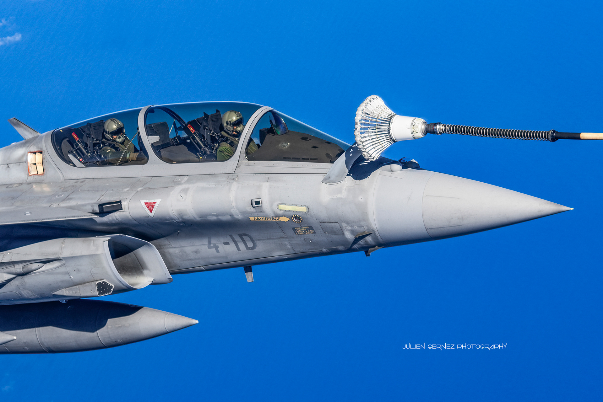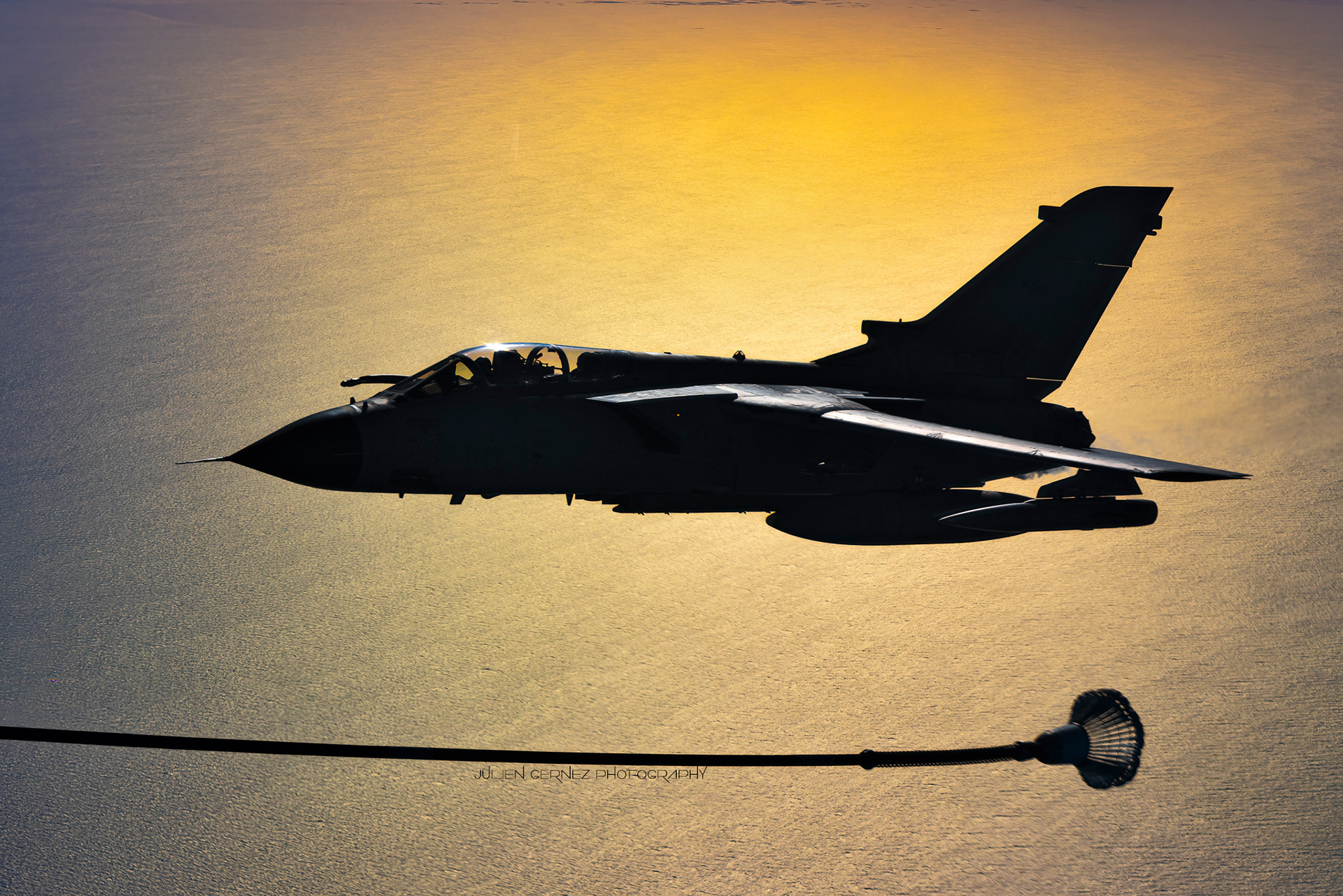 À 10h05 précise, confortablement installés à bord, nous commençons le roulage vers la piste 33, puis, à l'heure dite, nous décollons et entamons rapidement un large virage à gauche en direction de notre premier hippodrome situé au large des côtes marseillaises. À 10h35, comme prévu, les premiers clients, deux Tornado IDS italiens (indicatif COUGAR), sont déjà annoncés et en position dans le sillage du MRTT. Le timing étant très serré, les équipages italiens sont autorisés à effectuer une rejointe directe sur le Phénix sans avoir besoin de rejoindre la position d’attente à gauche du ravitailleur comme le veut la procédure standard. Sur ordre de l’ARO, les Tornado sont rapidement autorisés au contact pour un ravitaillement en duo de chaque côté de notre avion. Après 5 minutes de biberonnage, les deux jets se déconnectent, se rassemblent sur notre aile droite avant d’accélérer pour poursuivre leur mission. Notre MRTT de son côté change de cap pour se rapprocher de la Corse en direction du second hippodrome prévu pour cette mission.